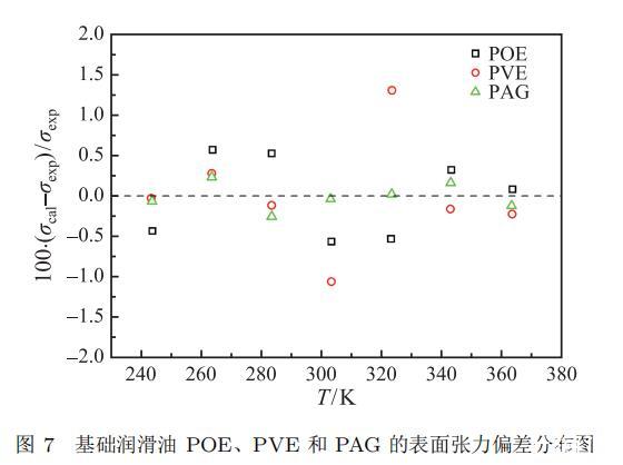 式中,T 是溫度,K;σ 是表面張力,mN·m?1;a、b 和 c 為關聯方程的擬合參數?;A潤滑油 POE、PVE 和 PAG 的參數關聯值和絕對平均偏差列于表 4 中,其實驗數據與關聯方程的絕對平均偏差分別為 0.43%、0.45% 和 0.13%;三種基礎潤滑油的相對偏差分布如圖 7 所示,其實驗測量結果的相對偏差均在 ±1.5% 以內,表明實驗結果與關聯方程的吻合良好。