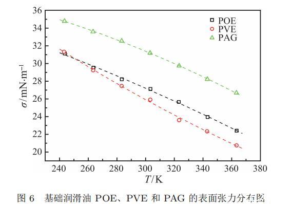 實驗測量了 POE、PVE 和 PAG 三種基礎潤滑油在常壓環境的表面張力,其溫度范圍為 243.15 ~ 363.15 K,實驗測量結果如表 3 所示。鑒于基礎潤滑油的飽和蒸汽壓非常低,需要在實驗裝置內充入一定壓力氣體來確保懸垂液滴的穩定形成,充入的氣體應不易溶于基礎潤滑油且低溫環境不會在玻璃觀察窗形成凝結液膜,因此在實驗測量過程中裝置內部充入 0.1 MPa 左右的氮氣。根據相應的實驗環境,表面張力測量所需的密度差 ?ρ 應為基礎潤滑油的液相密度減去氮氣的氣相密度,氮氣的氣相密度由 Refprop 軟件計算獲得。三種基礎潤滑油的表面張力隨溫度的變化趨勢如圖 6 所示,表面張力隨著溫度的增大而降低,在同一溫度條件下,PAG 表面張力最大,POE 次之,PVE 最??;但在 243.15 K 以下區域,PVE 的表面張力要大于 POE。