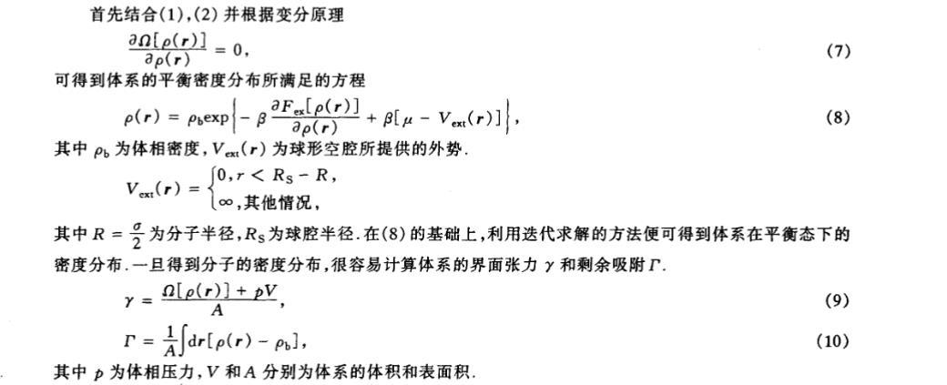 其中 R=σ/2 為分子半徑,Rs 為球腔半徑。在 (8) 的基礎上,利用迭代求解的方法便可得到體系在平衡態下的密度分布。一旦得到分子 的密度分布,很容易計算體系的界面張力 γ 和剩余吸附 Γ。