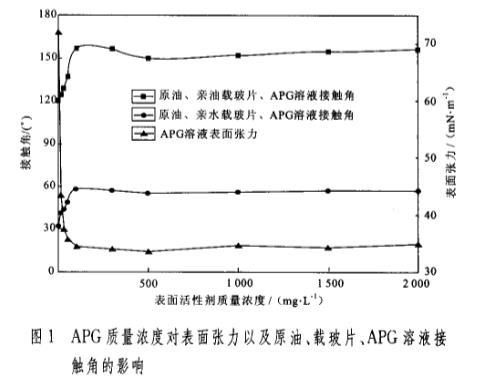 圖1 APG質(zhì)量濃度對表面張力以及原油、載玻片、APG溶液接觸角的影響