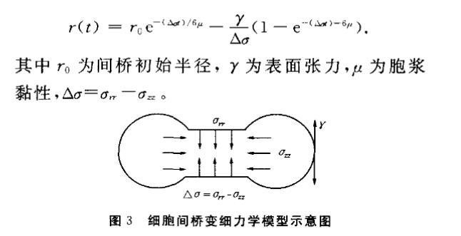 實驗采用間橋變細動力學模型對間橋變形進行分析和模擬,見圖3。該模型認為:肌球蛋白II所產生的徑向應力為主動力,促進胞漿從間橋向兩個子細胞流動;間橋末端以及子細胞胞漿黏性產生的軸向應力為被動力,阻礙胞漿從間橋向兩個子細胞流動。間橋半徑隨時間變化的函數表達式為: