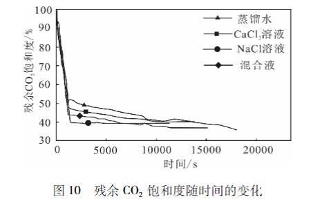 活塞式驅(qū)替階段:驅(qū)替液突破巖心前,驅(qū)替過(guò)對(duì)巖心中CO2的推擠,將巖心中大部分不受毛細(xì)力控制的CO2氣體排出,驅(qū)替出的CO2氣量大,殘余CO2飽和度隨時(shí)間迅速減小。攜帶驅(qū)替階段:驅(qū)替液突破巖心后,巖心中的大部O2氣體已被驅(qū)出,驅(qū)替液只能裹挾出受毛細(xì)制較弱的部分氣體和殘留的小部分自由氣體,所以從巖心中驅(qū)替出的CO2迅速減少,殘余CO2飽和度隨時(shí)間減小的速率也大大降低,隨著巖心CO2氣體不斷減少,殘余CO2飽和度最終趨于定。不同溶液驅(qū)替條件下殘余CO2飽和度趨于的速率由大到小依次為:10%CaCl2溶液、%NaCl溶液、蒸餾水。第二階段對(duì)最終的殘余CO2飽和度貢獻(xiàn)很小。本實(shí)驗(yàn)所使用的是飽和了CO2的驅(qū)替液,所以不存在Li等實(shí)驗(yàn)中的殘余飽和度曲線的溶解式驅(qū)替階段。