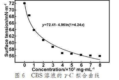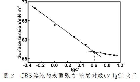 (1)CBS溶液的表面張力隨濃度的增大而降低,最后趨于平緩,此時(shí)表面張力為55.92 mN/m,并得出其臨界膠束濃度為4.0×10^-3 mg/mL。