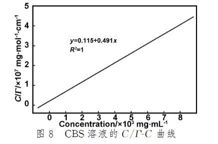 式(2)中,r為Gibbs吸附量,rm為飽和吸附量,C為溶質(zhì)濃度,k為吸附常數(shù)。以C/r對(duì)C作圖應(yīng)得到一條直線,其斜率倒數(shù)即為飽和吸附量rm。圖8即為CBS溶液的C/r-C圖。從圖8可以計(jì)算出CBS溶液的飽和吸附量為2.03×10^-10 mol/cm^2,這與γ-lg C和r-C兩種曲線擬合的結(jié)果基本相等。