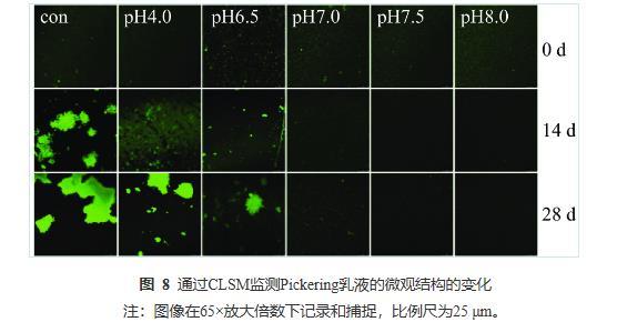 由圖8可知,當儲藏14 d時,Con、pH4.0的乳液均出現大面積的油滴聚集,pH6.5的乳液出現局部小聚集,而pH7.0~8.0的乳液微觀結構顯示其分布仍然均勻,無任何油滴聚集現象。當儲藏28 d后,Con、pH4.0、pH6.5的乳液中聚集程度明顯加強,pH7.0的乳液也有較微弱的局部小聚集現象;而pH7.5與pH8.0的乳液仍保持良好的分布狀態,這與圖7的視覺直觀圖、表2粒徑監測和表3電位監測的結果保持一致。CLSM的結果再次證實PPP-NP穩定的乳液酸性條件下的長期穩定性較差,在中性和堿性條件下有著更好的乳液穩定性。這一結果與He等的結果相似,其所制備的樣品同樣在堿性條件下穩定性更高。