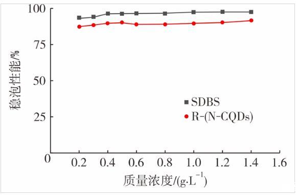從圖7可看出,R-(N-CQDs)的起泡能力表現不佳,雖然在高質量濃度下其起泡能力相比低質量濃度時有一定的提高,但是相對于SDBS的起泡能力仍存在較大的差距,這與R-(N-CQDs)自身結構有關,SDBS是直鏈結構,而R-(N-CQDs)結構上存在很多支鏈,形成泡沫時需要克服更多的表面能做功,所以形成的泡沫比SDBS更少。