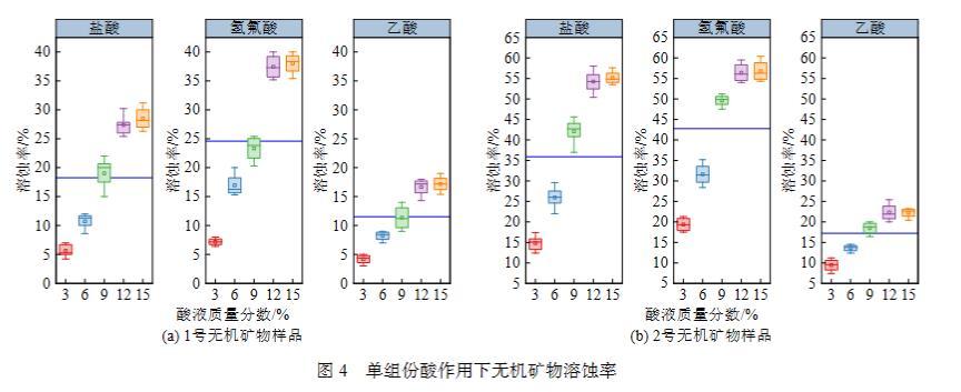圖3為單組份酸作用下無機礦物溶蝕試驗記錄,圖4為無機礦物溶蝕率。由圖4可知,氫氟酸對2種無機礦物樣品溶蝕效果最佳,質量分數為15%的氫氟酸對1號無機礦物樣品的溶蝕率最高達40.2%,平均為37.3%;質量分數為15%的氫氟酸對2號無機礦物樣品的溶蝕率最高達59.5%,平均為56.6%。這是由于氫氟酸專適用于硅質物等砂巖地層的酸化,氫氟酸對無機礦物的溶蝕速度很快,但是這會導致酸液作用時間短、酸化距離近的缺點。鹽酸溶蝕無機礦物能力較氫氟酸弱、較乙酸溶蝕能力強,質量分數為15%的鹽酸對1號無機礦物樣品的溶蝕率最高達31.8%,平均為27.7%;質量分數為15%的鹽酸對2號無機礦物樣品的溶蝕率最高達57.5%,平均為54.6%,可見鹽酸對無機礦物有較高的溶蝕率,且具有成本低、生成物可溶、氫離子濃度高的優點。雖然乙酸較鹽酸與氫氟酸對無機礦物溶蝕率低的多,但是乙酸是有機酸,為弱酸,具有緩慢釋放氫離子的效果,具有緩速性起酸蝕緩速效果,可延長酸液有效距離。