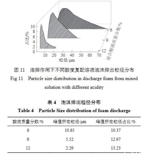 結(jié)合泡排作用下泡沫酸起泡效果與泡沫酸潤濕攜帶效果,優(yōu)選出QPJ-02酸液為效果最好的泡排復(fù)配溶液。圖11為QPJ-02質(zhì)量分?jǐn)?shù)為0.6%時,復(fù)配不同濃度酸液后泡沫排出粒徑分布。由圖11可知,酸液濃度越高,泡排作用下排出無機礦物粒徑越小,粒徑范圍越小。當(dāng)混合酸液質(zhì)量分?jǐn)?shù)為6%時,無機礦物排出粒徑最高為10.65μm,約為酸液質(zhì)量分?jǐn)?shù)為12%時無機礦物排出粒徑的4.65倍,為酸液質(zhì)量分?jǐn)?shù)為9%時無機礦物排出粒徑的2.41倍。這是由于酸液對無機礦物表面的刻蝕削減作用,而無機礦物粒徑越小,越易被泡沫攜帶出煤層氣井,因此注氣泡排作用下結(jié)合泡沫酸的潤濕攜帶效果與酸液的溶蝕效果對于低產(chǎn)煤層氣井無機礦物的解堵增滲是十分重要的。