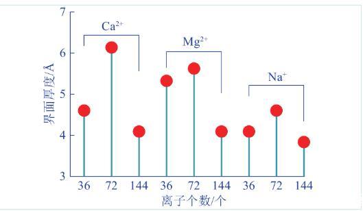 溶劑密度從10%升到90%的范圍為界面層,通過相對數密度分布曲線可估算出界面厚度。不同濃度含鹽泡沫體系界面厚度變化的火柴圖,如圖4所示。由圖4可知,不同濃度含鹽泡沫體系界面厚度隨濃度的變化規律一致。即當離子種類一定時,高濃度含鹽泡沫體系的界面厚度最小,低濃度次之,中濃度最大。對于低濃度含鹽泡沫體系而言,Mg2+的界面厚度最大,Ca2+次之,Na+最小;中濃度含鹽泡沫體系中,Ca2+的界面厚度最大,Mg2+次之,Na+最小;高濃度含鹽泡沫體系中,Mg2+的界面厚度最大,Ca2+次之,Na+最小。綜上可知,硬水離子的存在使得泡沫界面厚度有所增加,這意味著界面中水分子內部的相互作用減弱,使得界面水分子受到的指向泡沫內部的不平衡拉力減弱。