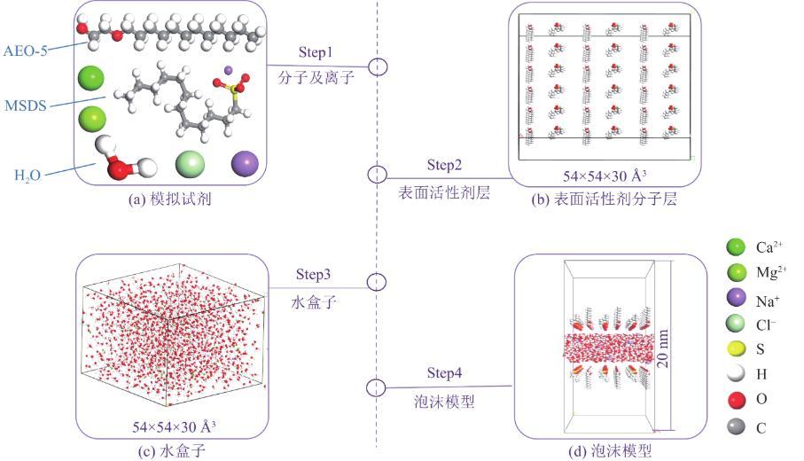 采用Materials Studio中的Visualizer模塊構建模擬所需的分子及離子,并利用Forcite模塊分配立場與電荷,圖1a為各種分子及離子優化后的模型。其次,利用Crystals模塊創建含有優化好的1個MSDS陰離子與1個AEO-5分子的9×18×30?3(a×b×c)晶胞結構,通過Symmetry中的Supercell功能,將構建好的晶胞結構沿a、b和c方向分別擴展6、3和1個,得到1個54×54×30?3的表面活性劑分子層,如圖1b所示。然后,利用Amorphous Cell模塊構建1個由1 500個水分子和無機鹽離子組成,尺寸為54×54×30?3的水盒子,如圖1c所示。最后,依據甘建建立的泡沫液膜模型,利用Build Layer功能,得到54×54×200?3的“三明治”泡沫模型,如圖1d所示。基于截斷半徑要求,模擬體系Z軸方向水層上下各添加5 nm厚度的真空層。