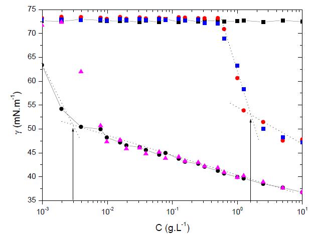 微流控技術是一種利用微米尺度管道及其它輔助手段對納升、皮升級流體單元進行主、被動操縱的新興技術。近年來,Karakasyan研究團隊應用微液滴微流控技術制備出單分散響應型的聚醚胺-海藻酸鹽共聚的微凝膠(Colloids and Surfaces B:Biointerfaces,2015,135,619–629),聚醚胺(PEA)與環(huán)氧丙烷/環(huán)氧乙烷(29/6)通過兩種分子之間的胺鍵相連接枝共聚得到海藻酸鹽接枝型的微凝膠。液滴微流控技術為海藻酸鹽接枝微凝膠提供了精準的尺寸和物理化學性質(zhì)控制,使得這些微凝膠與單獨的海藻酸接枝鏈比,仍然保持有兩親型和熱敏性等性質(zhì),應用表面張力測試技術研究微凝膠的表面化學性質(zhì),通過使用Delta-8高通量表面張力分析儀,采用Du Nouy-Padday法(最大拉力法)測試了不同濃度比例的組成聚醚胺-海藻酸鹽共聚物化合物的表面張力,并自動將表面張力記錄到系統(tǒng)中,由于Delta-8高通量表面張力儀能夠一次性測試96個樣品,軟件對測試的樣品的數(shù)據(jù)能夠進行自動分析,從而獲得了聚醚胺-海藻酸鹽共聚物的臨界聚集濃度(CAC)以及臨界膠束濃度(CMC)。(如下圖1所示)。