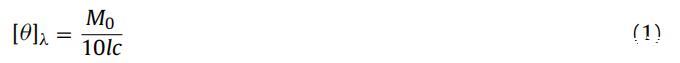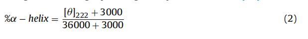 其中 θλ 是在波長處觀察到的橢圓度(以毫度為單位) λ,M0 是蛋白質的平均殘基重量,c 是蛋白質 以克/立方厘米為單位的濃度,l 是細胞的光程長度,以厘米為單位。 222 nm 處的橢圓度值 (θ222nm/mdeg)用于計算BSA的α-螺旋含量 使用 Morrisett 等人給出的以下等式。 [44]
