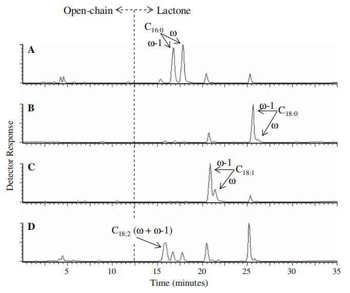 在4個SL中,只有一個SL-p的x-連桿總數大于x-1-連桿。 具體而言,在75%的棕櫚酸殘基中,39%通過x位置連接,36%通過x-1位置連接。 在其他情況下,大部分(至少71%)的脂肪酸通過x-1位置結合(亞油酸在所用LC方法下不可溶解,因此被報告為x和x-1組合結構)。 這些結果表明,為了形成內酯,糖苷鍵和酯鍵之間必須至少有15個甚至17個碳單元。 SL-o和SL-s中對x-1連接的極大偏好表明17個碳是內酯形成的首選碳。 然而,通過將棕櫚酸連接到x碳處的SL,鏈長度增加了1個碳單元(鍵間16個碳),使得內酯的形成比連接到x-1碳(鍵間15個碳)時更有利。 SL-p中存在C17:0脂肪酸含量較低(3%)的SLs進一步證實了這一點,而SL-s、SL-o和SL-l中沒有C17:0脂肪酸夾雜的跡象。 根據這些數據和二乙?;瘍弱シ植迹ㄒ姳?),得出結論,對于SL包裹體測試的單個脂肪酸,其優先順序為油酸、硬脂酸、棕櫚酸和亞油酸,以及C18脂肪酸, 單原子飽和優于飽和和雙不飽和。