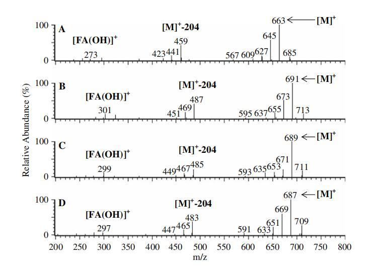 圖3正大氣壓化學電離(APCI)-來自圖2中每個TIC色譜圖基峰的質譜圖。 圖2的TIC中的C16:0二乙?;敝瑑弱ィ≧T=16.7分鐘)、圖2的TIC中的C18:0二乙?;敝瑑弱ィ≧T=25.2分鐘)、圖2c的TIC中的C18:1二乙?;敝瑑弱ィ≧T=20.7分鐘)和圖2d的TIC中的C18:2二乙?;敝瑑弱ィ≧T=15.8)。 ([M]+=質子化分子離子;[M]+-204=質子化分子離子-減去乙酰化己糖(質量204);[FA(OH)]+=質子化羥基脂肪酸)