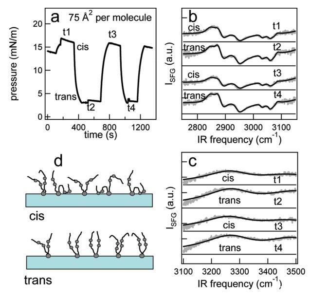 圖4。 (a) 在每分子面積為75?2的脂質/H2O界面處,作為光開關脂質時間函數的表面壓力。 用370和450 nm光照射 ~ 100秒分別產生順式(高壓)和反式(低壓)狀態。 壓力的微小劇烈波動是由于樣品高度的變化,以校正水的蒸發。 (b和c)CH和OH區域(灰色)中相應的VSFG光譜以及洛倫茲線形狀模型的擬合(見正文)。 為了清晰起見,光譜已被抵消。 t1至t4對應于面板a中獲取光譜的時間。 (d) 脂質尾部方向的示意圖。 光開關脂質的偶氮苯部分用灰色圓圈表示。
