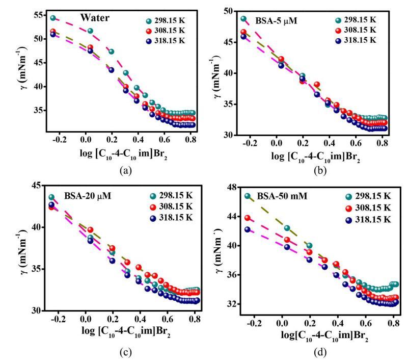 圖2. 在含有(a)0(b)5,(c)20和(d)50μM BSA的水溶液中,表面張力(γ)與log[C10-4-C10im]Br2的關系。