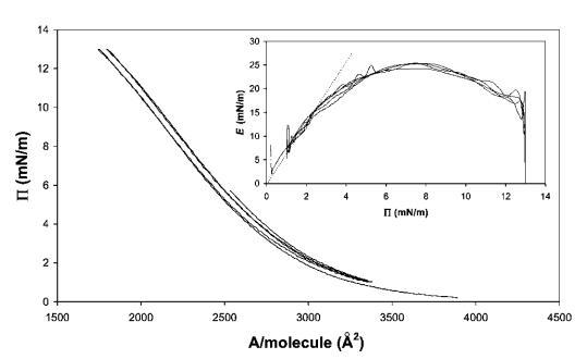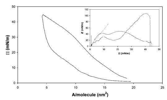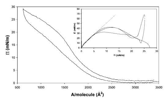 圖7在20℃下測(cè)量的15 mg b-乳球蛋白在中性pH水上的P–A和(插圖)E–P曲線。 插圖中繪制的虛線表示E–P曲線的初始坡度。