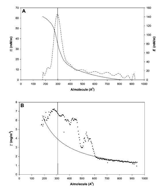 圖3 HFBII的代表性壓縮等溫線,壓縮量遠(yuǎn)低于每個(gè)分子的面積。 (A) P(-)和E(---)與每個(gè)分子的面積的關(guān)系。 (B) 攤鋪量和壓縮(Gcomp,-)預(yù)期的表面載荷,并通過(guò)橢偏儀(Gell,A)測(cè)量。