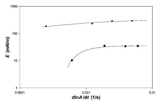 頻率依賴性。 為了評(píng)估其中一些系統(tǒng)中粘性損失的重要性,我們對(duì)b-lg和HFBII進(jìn)行了頻率相關(guān)的表面膨脹流變。 對(duì)于表面膨脹流變學(xué),我們顯示了在18<P<22 mN m-1之間測(cè)量的小變形模量(見(jiàn)圖10)。 注意,變形率d(lna)/dt為0.0012 s 1對(duì)應(yīng)于5 mm min 1的勢(shì)壘速度,用于大變形實(shí)驗(yàn)。 相比之下,歧化時(shí)間約為0.5小時(shí),接近泡沫實(shí)驗(yàn)觀察到的粗化時(shí)間。 HFBII的數(shù)據(jù)表明,在所研究的變形速率范圍內(nèi),變形速率對(duì)E的影響適中。 對(duì)于b-乳球蛋白,頻率的影響更為明顯,因此,在變形速率低于0.001 s 1時(shí),可觀察到E的強(qiáng)烈下降。 這表明b-lg的粘性損失比HFBII更為明顯。 這一比較再次表明,b-lg的外觀更柔軟,壓縮/膨脹時(shí)解吸/吸附能力更強(qiáng)。