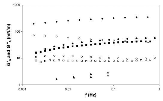 表面剪切流變學(xué)。 所有四個(gè)系統(tǒng)的表面剪切流變測(cè)量如圖11所示。 我們觀察到HFBII具有模量,比b-乳球蛋白和皂甙高一個(gè)數(shù)量級(jí),這與早期結(jié)果一致。25值得一提的是,對(duì)于像奎拉葉皂甙這樣的表面活性劑,測(cè)得的表面剪切彈性非常高。 b-酪蛋白的表面剪切模量要低一個(gè)數(shù)量級(jí)。 關(guān)于頻率,我們發(fā)現(xiàn)與HFBII相比,皂甙和b-乳球蛋白對(duì)頻率的依賴性更強(qiáng),尤其是在低頻率下。 此外,對(duì)于HFBII而言,Gs 00/Gs0的比率是最低的,即表面彈性對(duì)模量的貢獻(xiàn)比表面粘度大得多。 當(dāng)我們向交叉點(diǎn)外推時(shí),我們預(yù)計(jì)HFBII和b-乳球蛋白或皂甙之間的弛豫時(shí)間會(huì)有一個(gè)數(shù)量級(jí)的差異。 對(duì)于b-酪蛋白,從0.01 Hz左右的數(shù)據(jù)可以很容易地觀察到交叉點(diǎn)。