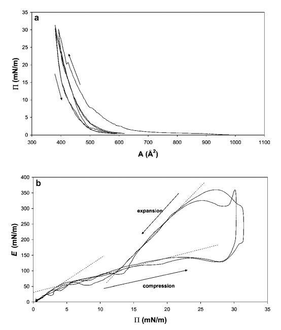 b-乳球蛋白。圖7顯示了b-乳球蛋白的壓縮等溫線。這條曲線遠(yuǎn)沒(méi)有HFBII曲線陡峭,拐點(diǎn)更為明顯。盡管在屏障運(yùn)動(dòng)逆轉(zhuǎn)時(shí)觀察到滯后現(xiàn)象。E–P曲線的初始斜率為4.3,遠(yuǎn)小于低P區(qū)的HFBII,表明b-lg分子在界面中相對(duì)較軟。觀察到E的平滑最大值為43 mN m-1,之后在進(jìn)一步壓縮至28 mN m-1時(shí),不再檢測(cè)到E的恢復(fù)。結(jié)果與早期的研究結(jié)果一致。40,41在屏障逆轉(zhuǎn)時(shí),觀察到E的超調(diào),再次表明結(jié)構(gòu)無(wú)法適應(yīng)突然膨脹和斷裂。