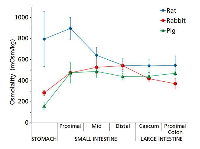 三種動物模型的胃腸內(nèi)容物的滲透壓通常遵循相同的趨勢,胃低,近端小腸增加,遠端減少。豬似乎沿著這種模式一直到盲腸,在結(jié)腸處進一步輕微增加(圖2)。然而,在大鼠中,由于胃滲透壓的高度可變性,胃內(nèi)容物的滲透壓與近端和中端小腸的滲透壓沒有統(tǒng)計學(xué)差異。這種滲透壓模式通常與消化系統(tǒng)的生理學(xué)相一致,在消化系統(tǒng)中,大多數(shù)食物在小腸中被消化并分解為葡萄糖、氨基酸和脂肪酸等組成成分,因此液體的滲透壓較高。隨著營養(yǎng)被腸道進一步吸收,內(nèi)容物的滲透壓降低。