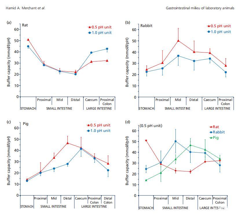 圖1(a)來自大鼠(n=3),(b)兔子(n=6),(c)豬(n=3)的混合樣品的胃腸液(上清液)緩沖容量(平均值±標(biāo)準(zhǔn)偏差(SD)),在pH單位變化0.5和1.0時測量,以及(d)整個胃腸道緩沖容量的種間趨勢。