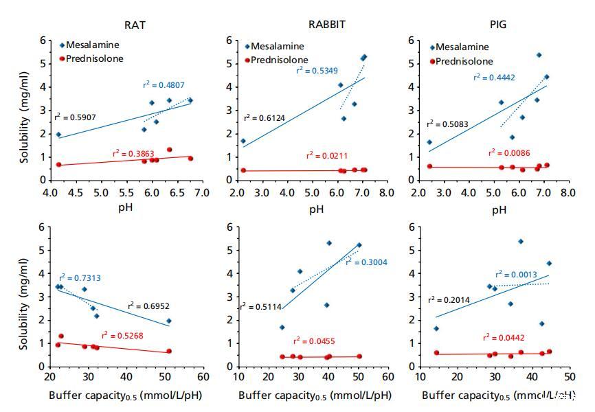 需要注意的是,F(xiàn)adda等人[11]報告了使用體液的相關(guān)性 未考慮胃液中的溶解度,這在此處介紹的動物液中的相關(guān)性中得到了解釋。有趣的是,在排除動物液中的胃溶解度后,人和動物液中的相關(guān)性變得相似(圖5中的虛線) 此外,盡管區(qū)域pH值和緩沖容量較高,但豬遠端小腸的平均溶解度并不高于中小腸(表1),這可以通過該區(qū)域較高的表面張力(44±6 vs.35±3)來解釋 表面張力與美沙拉秦在兔子體內(nèi)的溶解度之間存在一定的親和力(標(biāo)準(zhǔn)化系數(shù)β)= ? 0.802,P=0.055;r2=0.643)。需要注意的是,用于產(chǎn)生這些相關(guān)性的pH值對應(yīng)于液體上清液中的測量值,這不一定與腸道中的原位pH值相關(guān)。