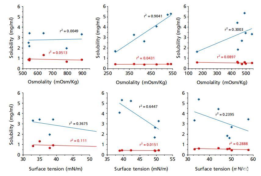 圖5:美沙拉秦(藍色鉆石)和潑尼松龍(紅色圓圈)在大鼠、兔和豬胃腸液(上清液)中的溶解度與其pH值、緩沖容量、滲透壓和表面張力的函數(shù)關(guān)系,其中藍色虛線表示除胃液外的美沙拉秦相關(guān)性。