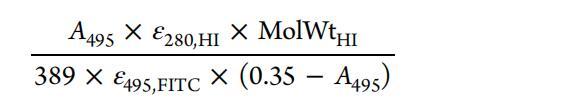 熒光光譜法用于選擇含有FITC-HI的小份樣品。 FITC探針在494nm激發時顯示出517nm的發射。 人們注意到,當探針與HI共軛時,FITC發射的強度增加。 吸收光譜法用于確定HI與FITC的比率,該比率由下式計算得出。21