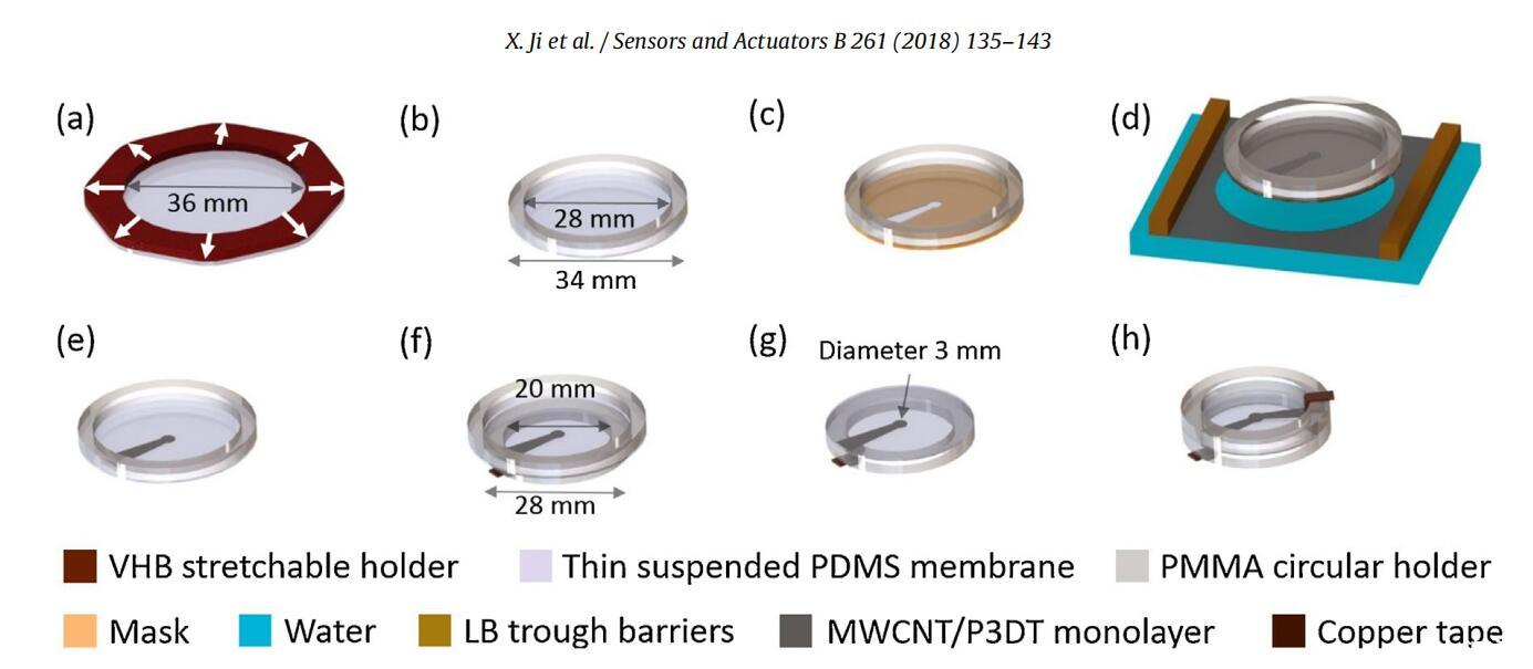 圖2。采用LS技術制備1.4μm厚DEA的工藝。(a)懸浮式PDM(Sylgard 186)等雙軸預拉伸(初始厚度:2.0μm,拉伸后:1.4μm)。(b)懸浮拉伸1.4μm厚的PDMS膜,固定在PMMA支架上。(c)在懸浮膜上放置一個面罩。(d)在空氣-水界面形成的單層電極在帶有掩膜的懸浮PDMS膜上的LS轉移。(e)PDMS上的圖案化單層電極。(f)將覆蓋有圖案化單層電極的PDMS膜轉移到較小的PMMA支架上。(g)圖案化單層電極位于PDMS的下側,電極與銅帶連接,PDMS的上側不帶電極。(h)采用LS電極技術制造DEA。