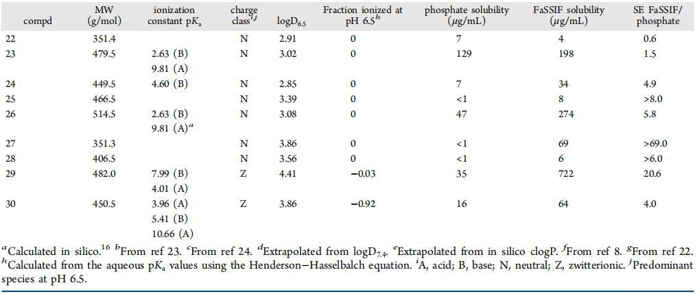 以前曾使用一組參考化合物觀察到,電離酸性化合物的硒通常低于電離堿。結果表明,由于與帶負電荷的FaSSIF介質組分之間的靜電排斥作用,離子酸在FaSSIF中的溶解度沒有增加。8在目前的研究中,對于幾個涵蓋更廣泛化學空間的專利化合物,我們沒有發現離子化酸或堿之間硒的任何顯著溶解度差異,這表明靜電相互作用可能被其他因素掩蓋或覆蓋,如化合物的構象和親油性。
