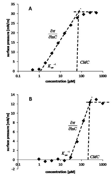 表面活性參數的測定。表面活性劑的主要參數由濃度-表面壓力曲線獲得。圖3中描述了代表性化合物的這些參數,表2中總結了完整的數據集。