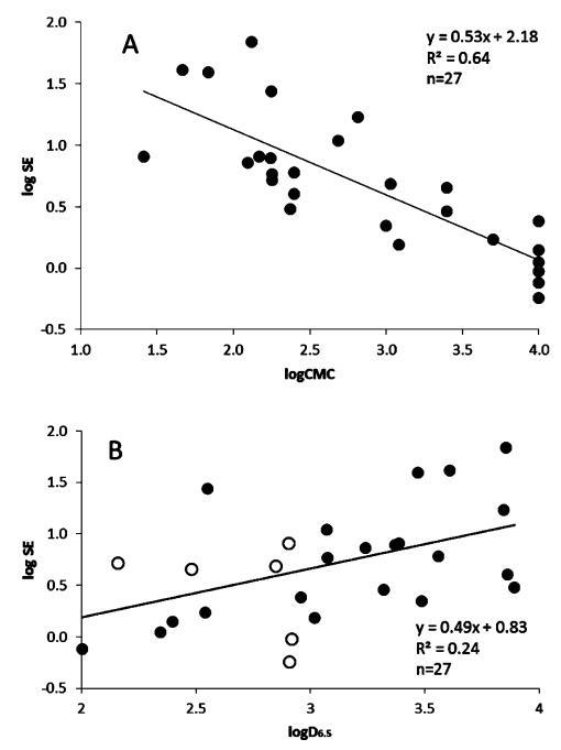 圖5。根據對數CMC(μM,A)和pH 6.5下的辛醇分配系數(logD6.5;B)繪制溶解度增強曲線。數據集僅限于顯示logD6的化合物。5個在2到4之間。圖B中的開放圓對應于從文獻檢索、預測或從pH值為7.4的logD推斷的logD值。高于或低于檢測限的值在檢測限處繪制。