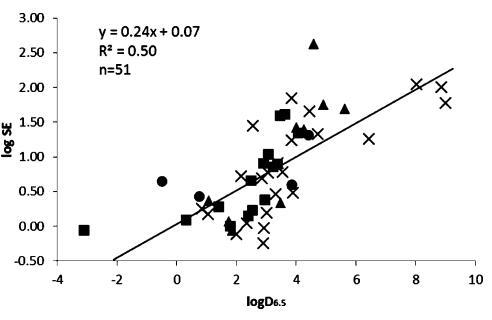 圖2。在pH值為6.5時,51種化合物的溶解度增強(SE=S_-FaSSIF/S_-水溶液)是辛醇/水分配系數的函數。化合物被歸類為酸(■),基地(▲),中性(×)和兩性離子(●).高于或低于檢測限的值在檢測限處繪制。