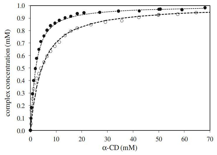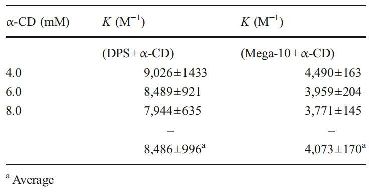 表1不同α-CD濃度下α-CD與DPS和Mega-10的1:1包合物的締合常數(shù)(Ka)值