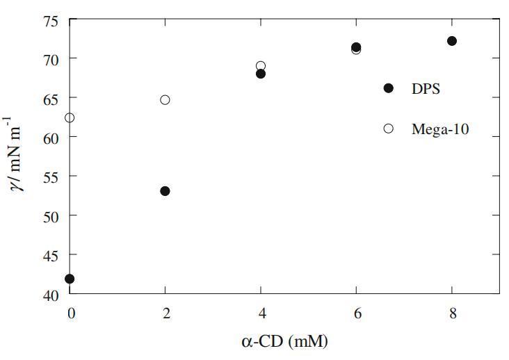 圖1恒定2 mM濃度下Mega-10和DPS的界面張力(γ)變化與α-CD濃度的關(guān)系圖