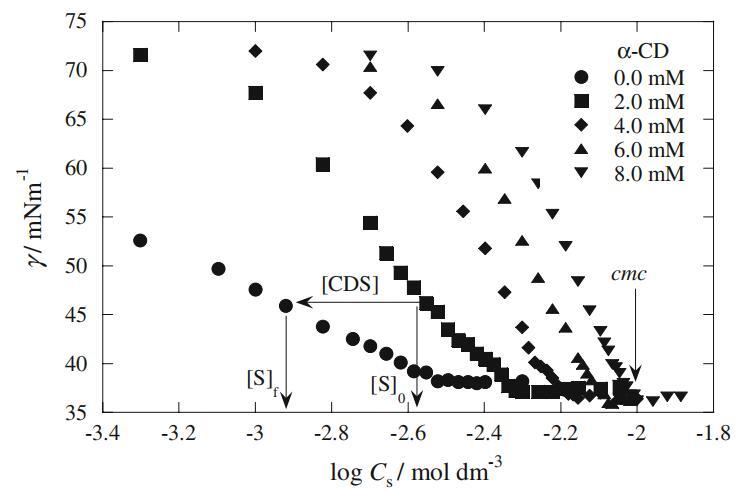 圖1顯示了2 mM Mega-10和DPS溶液的界面張力(γ)隨不同α-CD濃度的變化。兩種表面活性劑溶液的界面張力值均隨α-CD濃度的增加而增加。這種行為表明α-CD與Mega-10和DPS形成包合物,這些包合物沒有任何表面活性。在沒有α-CD的情況下,不同濃度的α-CD的界面張力對應(yīng)于γ值,這證實了CD本身不具有表面活性(數(shù)據(jù)未顯示)。圖2顯示了Mega-10和DPS(αDPS=0.8)混合體系在不同α-CD濃度下的總表面活性劑濃度的γvs.log曲線。每條曲線顯示與cmc對應(yīng)的斷點。在圖2中,由于α-CD中加入了表面活性劑單體,通過降低本體中的游離表面活性劑單體濃度延遲了膠束形成過程,因此每條曲線也移向更高的表面活性劑濃度。此外,cmc以上表面活性劑的γ值與α-CD濃度無關(guān)(圖2)。這表明表面活性劑與α-CD形成的包合物不參與界面吸附。在α-DPS=0.0、0.2、0.4、0.6和1.0時,在不存在和存在2-8mmα-CD濃度的情況下,獲得了類似的曲線圖(數(shù)據(jù)未顯示)。Mega-10和DPS的α-CD濃度依賴性cmc值如圖3所示。圖3清楚地顯示了cmc和α-CD濃度之間的線性關(guān)系。這一行為是表面活性劑和α-CDs之間形成包合物的另一個跡象,導(dǎo)致表觀cmc值增加。純Mega-10(5.75 mM)和DPS(2.57 mM)測定的cmc值與報告的文獻值一致[24–26]。
