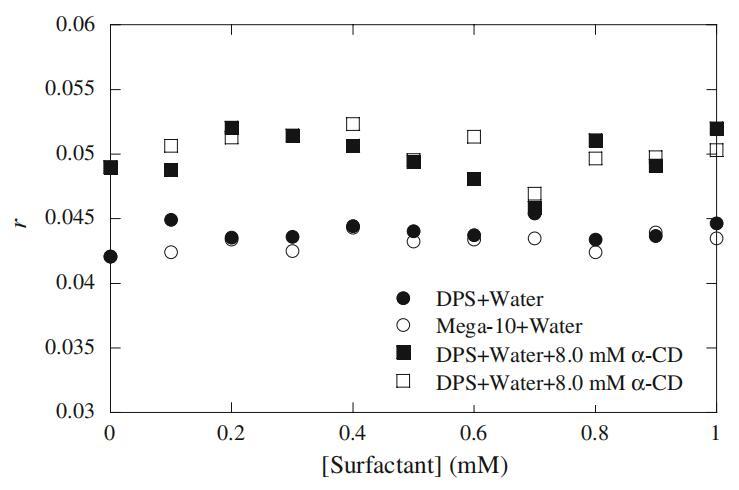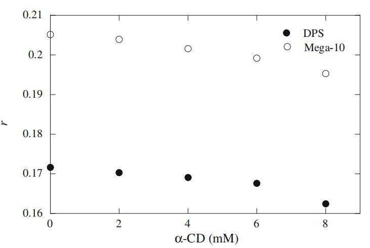 在這項工作中,我們研究了RB與表面活性劑-α-CD-水三元體系的詳細相互作用,以便系統(tǒng)地研究RB的極化行為。在進入膠束介質(zhì)之前,我們排除了RB與水溶液和水溶液α-CD介質(zhì)中前冰層表面活性劑濃度(1 mM)的結(jié)合行為。圖10顯示了在冰層前表面活性劑濃度下,Mega-10和DPS的RB各向異性行為。在水中和存在α-CD(8mm)的情況下,我們未觀察到表面活性劑RB的右旋值有任何顯著變化。從圖10獲得的結(jié)果意味著探針RB不與表面活性劑單體、環(huán)糊精和α-CD表面活性劑包合物結(jié)合。在這些初始測量之后,我們將我們的實驗方法擴展到膠束介質(zhì),以觀察RB的各向異性行為。圖11顯示了純表面活性劑以及Mega-10和DPS二元混合物(15mm)的α-CD(2-8mm)依賴性各向異性行為。從圖11可以得出一些有趣的結(jié)論。首先,圖11清楚地表明,在水介質(zhì)中,純Mega-10的膠束比DPS的膠束具有更高的微粘度。這種行為可以用表面活性劑分子在膠束中的堆積排列來解釋,表明Mega-10膠束中的堆積比DPS膠束中的更緊密。對于二元混合物,r值隨著DPS(αDPS)摩爾分數(shù)的增加而減小,這表明DPS被誘導(dǎo)到混合膠束中產(chǎn)生的剛性結(jié)構(gòu)較低(參見圖11中最左邊的圖例)。其次,在DPS的每摩爾分數(shù)下,r值隨α-CD濃度的增加而線性減小。盡管隨著α-CD濃度的增加,在αDPS=0.0時,r值的下降更為瞬時。我們注意到,r值的瞬時降低是由于膠束濃度的降低。為了證實這一結(jié)果,我們在20 mM濃度下對αDPS=0.0(即Mega-10)進行了各向異性測量,圖12中繪制了Mega-10的觀測r值,并與15 mM濃度下的αDPS=1.0(即DPS)進行了比較。正如我們所見,隨著α-CD濃度的增加,Mega-10(20 mM)的r值沒有瞬時下降,這表明圖11中r值的急劇下降是由于膠束濃度的降低。DelaCruz等人研究了RB衍生物與陰離子、陽離子和非離子表面活性劑的相互作用,并得出結(jié)論,RB衍生物的酯鏈的電荷和長度控制著與不同膠束系統(tǒng)的相互作用[35]。