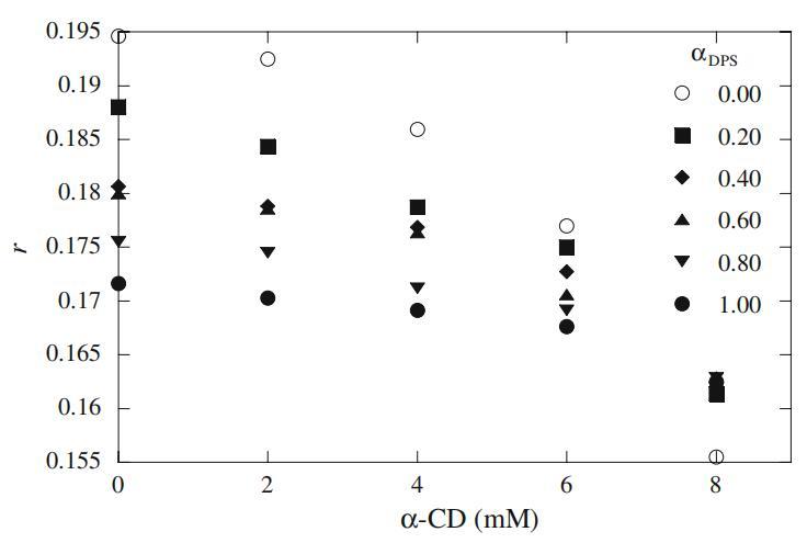 根據(jù)方程式15,我們計算了在不存在和存在α-CD的情況下當前二元混合物的膠束組成(X1)。圖9顯示了混合膠束(X1)和體積摩爾分數(shù)(α1)中表面活性劑的組成。從圖9可以得出結(jié)論,在αDPS=0.2時,混合膠束中DPS的組成接近40%。存在α-CD時的X1值始終低于水的X1值。這種行為可能反映出α-CD通過降低其結(jié)合最強的表面活性劑的量來改變成分(見Ka值)。一般來說,CDs不與膠束相互作用,但CDs可能通過與溶液中的表面活性劑相互作用影響膠束的組成,從而改變膠束的平衡和組成。熒光各向異性為了研究混合膠束中兩種不同組分的行為,我們還使用RB作為熒光探針進行了偏振熒光測量。這種探針在膠束介質(zhì)中已經(jīng)得到了很好的表征[33]。探針熒光發(fā)射的去極化程度是其激發(fā)態(tài)壽命期間旋轉(zhuǎn)擴散的度量。熒光各向異性(r)通過Perrin方程與探針周圍的粘度相關(guān),如下[34]: