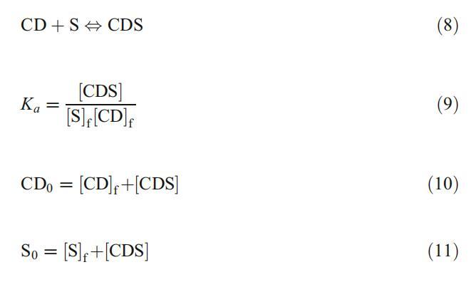 其中,CD/S、[S]f、[CD]f、CD0和S0分別為包合物、游離表面活性劑、游離CD、總CD和總表面活性劑濃度。通過組合和重新排列等式。9-11,我們得到了以下關(guān)系式: