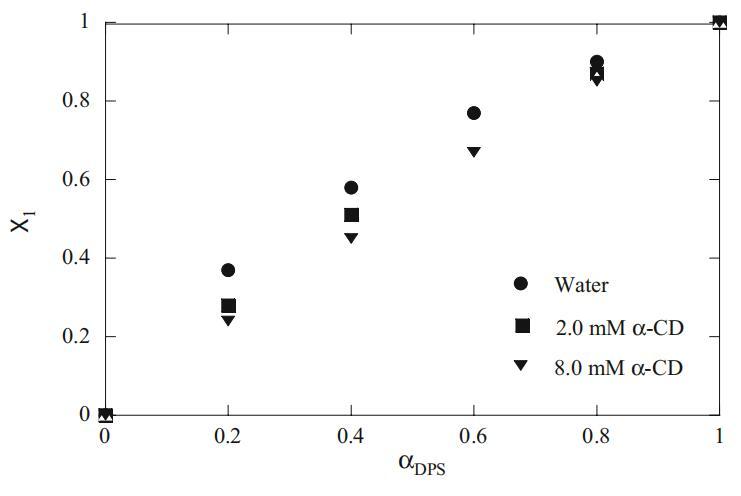 圖9 Mega-10+DPS混合體系在水中和不同α-CD濃度下的膠束(X1)與α-DPS的曲線圖
