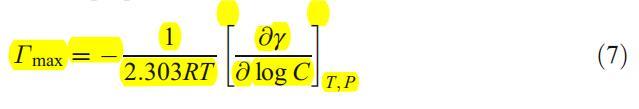 根據(jù)γ與log Cs/mol dm的曲線圖?3,我們評估了純表面活性劑和混合表面活性劑在空氣-水界面上的界面吸附參數(shù),在沒有和存在不同的α-CD濃度的情況下。表面活性劑在cmc下的表面過量值Γmax表示表面活性劑在空氣-水界面上的吸附量。稀溶液的表面過剩值可根據(jù)吉布斯方程確定,如下[27]: