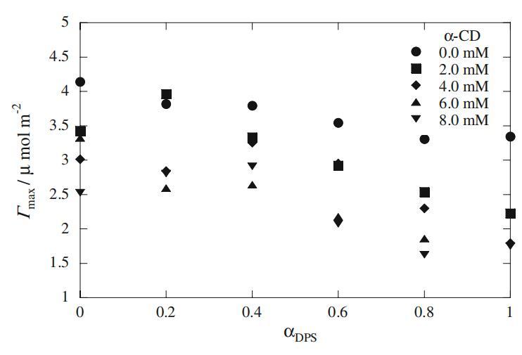 式中,γ、C、R、T和P為界面張力、表面活性劑濃度、理想氣體常數(shù)、溫度和壓力。純系統(tǒng)和混合系統(tǒng)的Γmax值如圖4所示。純Mega-10和DPS分子的Γmax值與文獻報道的值一致[26,28]。圖4顯示Mega-10的Γmax值略高于DPS。這一結(jié)果表明,與DPS相比,Mega-10分子在空氣-水界面以更緊湊的形式排列。兩種表面活性劑的Γmax值隨著α-CD量的增加而減小,表明表面活性劑物種從界面上的解吸(圖4)。這種行為是表面活性劑與α-CD之間存在相互作用的另一個證據(jù)。對于Mega-10和DPS在不同DPS摩爾分數(shù)(αDPS)下的二元混合物,Γmax值隨著DPS量的增加而減小,表明DPS在界面上吸附后形成混合單層。