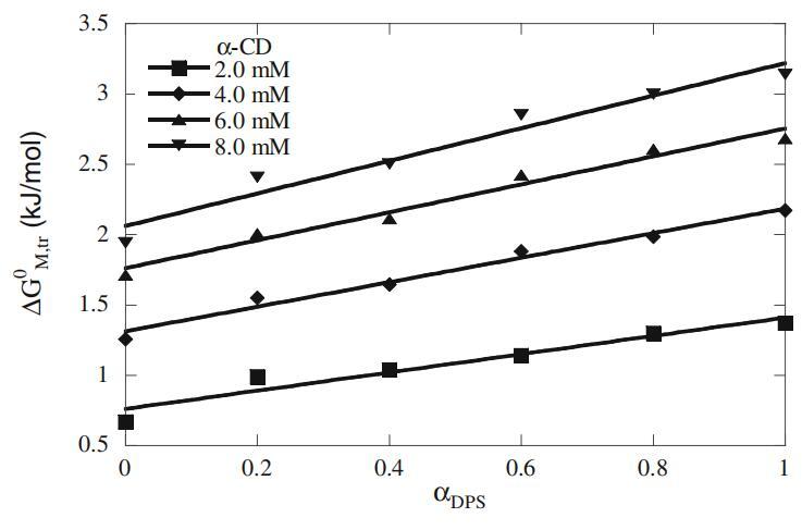 根據(jù)cmc值,我們評估了純表面活性劑系統(tǒng)和混合表面活性劑系統(tǒng)在不存在和存在α-CD的情況下的膠束化標準自由能(數(shù)據(jù)未顯示)[27],隨后,通過膠束轉(zhuǎn)移標準自由能評估添加劑對膠束化的影響(?GM,tr 0),從水相到含有α-CD的水相[19]。這些值如圖5所示,在不同α-CD濃度下,在整個DPS摩爾分數(shù)范圍內(nèi)為正值,表明α-CD的存在使膠束形成不利。此外,這些值隨著α-CD濃度的增加而線性增加,在高α-CD濃度下斜率更高,表明混合膠束的形成延遲。