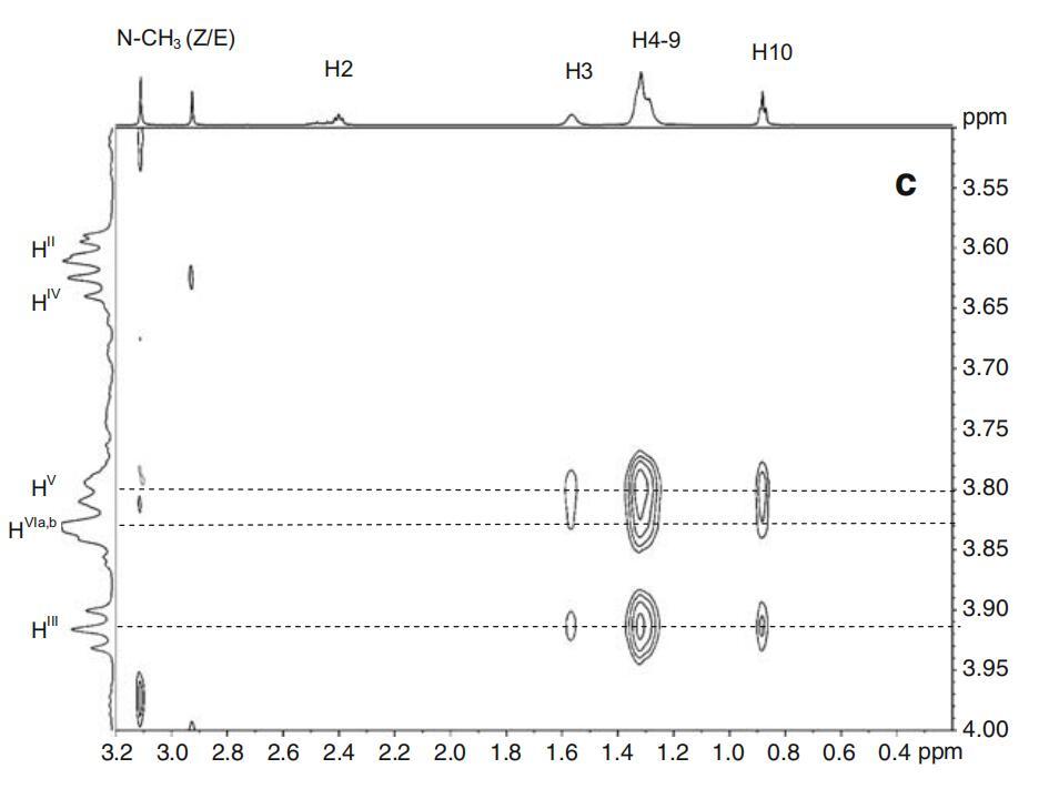 圖7α-CD(所示為一個吡喃葡萄糖苷單元)、DPS和Mega-10的示意圖。表面活性劑和α-CD的2D-ROESY光譜的關(guān)注區(qū)域。阿拉伯數(shù)字表示表面活性劑原子,而羅馬數(shù)字表示CD原子。b為DPS-α-CD系統(tǒng)。Mega-10-α-CD系統(tǒng)的c