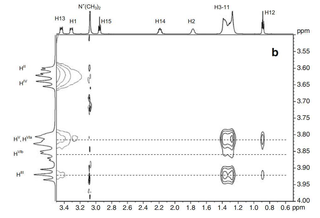 圖7a顯示了α-CD、DPS和Mega-10的示意圖,以簡化表面活性劑原子與CD原子的相互作用。2DROESY數(shù)據(jù)證明表面活性劑的烷基鏈包含在α-環(huán)糊精的疏水腔中。光譜如圖7b和c所示。可以看到表面活性劑共振與位于環(huán)糊精空腔內(nèi)的HIII、HV和HVI共振的交叉峰。未觀察到分子(HI、HII和HIV)外部與環(huán)糊精原子的相互作用。對于這兩種表面活性劑,與HIII和HV的相互作用似乎覆蓋了從末端甲基到H3的整個烷基鏈。這意味著幾個不同的復(fù)雜幾何形狀和穿透深度之間的快速交換。在鎘原子和親水性頭基之間沒有觀察到相互作用。