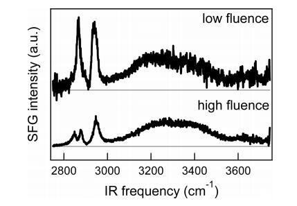 圖7。高密度水上DPPC的SFG光譜(SSP極化)(~每分子45?2)在低濃度下(~1.5 mJ/cm2)和高通量(~10 mJ/cm2),單脈沖加熱量分別在0.3至3°C(取決于紅外頻率)和2至19°C之間。為了清晰起見,對光譜進行了偏移,并根據(jù)相對紅外強度進行了縮放。注意,由于在高通量下發(fā)生的熱效應,形狀非常不同。這兩種光譜都是用非旋轉(zhuǎn)槽測量的。