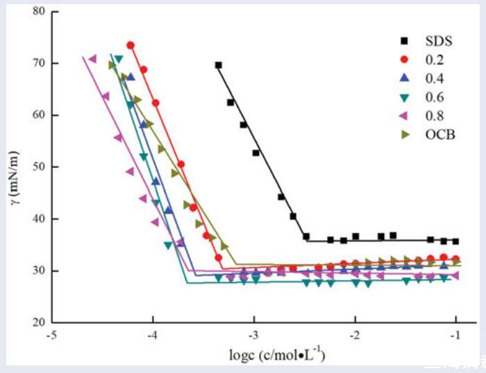 在這項工作中,我們以橄欖油、橄欖油羧基甜菜堿(OCB)和橄欖油磺基甜菜堿(OSB)為基礎合成了羧基甜菜堿和磺基甜菜堿表面活性劑。通過FT-IR和ESI-MS對其結構進行了表征。為了討論合成的兩性表面活性劑在兩性狀態下的協同效應,測量了它們的等電點(pI)以揭示在不同pH值下水溶液中的電荷狀態。然后在一定的等電點上進行了表面性質和協同作用的實驗??疾炝耸榛交撬徕c(SDBS)制備的表面活性劑在整個摩爾分數范圍內的臨界膠束濃度(CMC)、表面張力(γCMC)和其他表面活性參數。使用Clint方程分析了CMC與CMCid的偏差,以描述兩性離子/陰離子表面活性劑系統的非理想混合行為。根據規則溶液理論,評估了混合膠束中的膠束組成(X1m)和相互作用(βm),該理論已用于解釋許多二元表面活性劑系統的非理想行為。研究了無機鹽金屬離子NaCl和MgCl2的不同價態對OCB/SDBS和OSB/SDBS體系表面活性的影響。