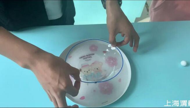 一、盤子中倒入泡泡水,塑料圈放入泡泡水中拿起,形成泡泡薄膜。